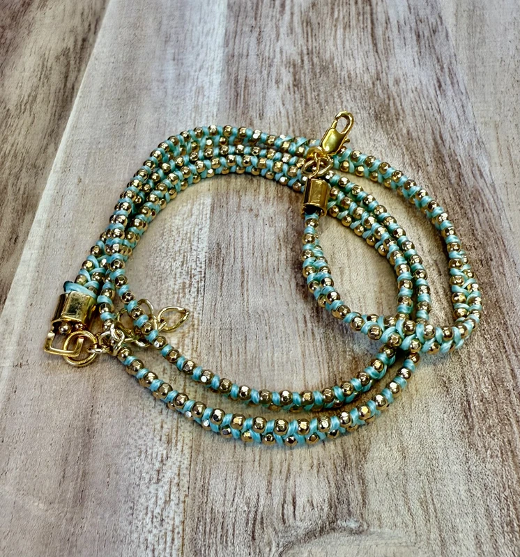 צמיד כדוריות זהב 2 מקרון קלוע בחוט שעווה וטרקיז