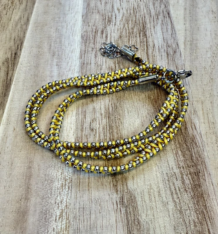 צמיד כדוריות כסף קלוע בחוט שעווה צבוע צהוב