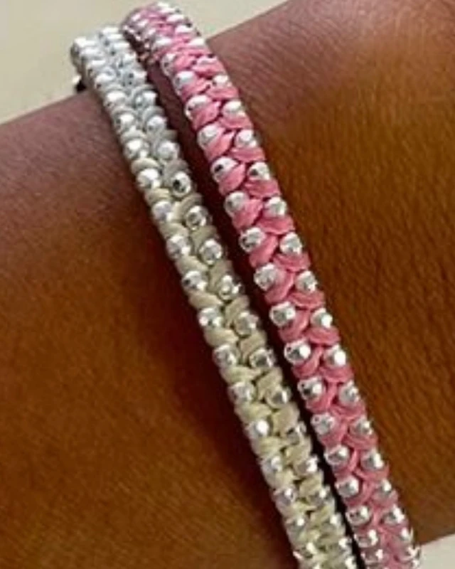 2 צמידים נפרדים קלועים בחוט שעווה שמנת ורוד על כסף איכותי