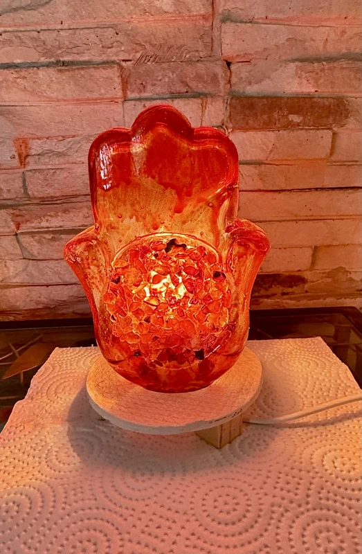 החמסה עשויה כולה מזכוכית מיוחדת ועליה מודבקים אבני קריסטל קרנליאן