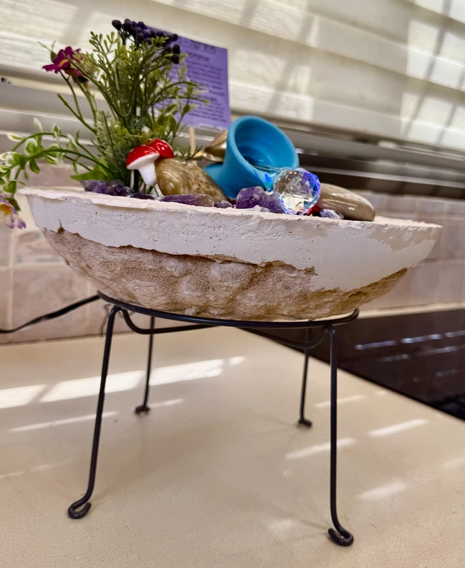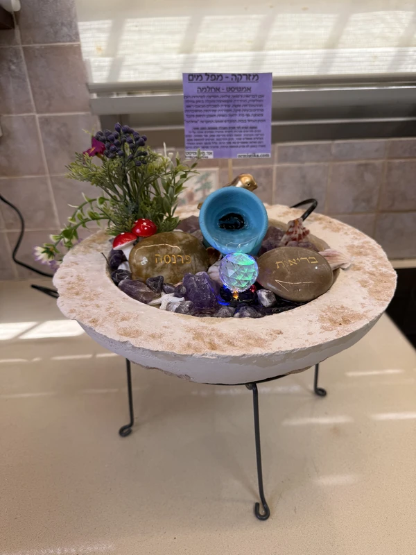 מזרקה כד כורכר מעוטר בעבודת יד אמטסיט עם צדפים עולל מעמד בגובה 10 סמ
