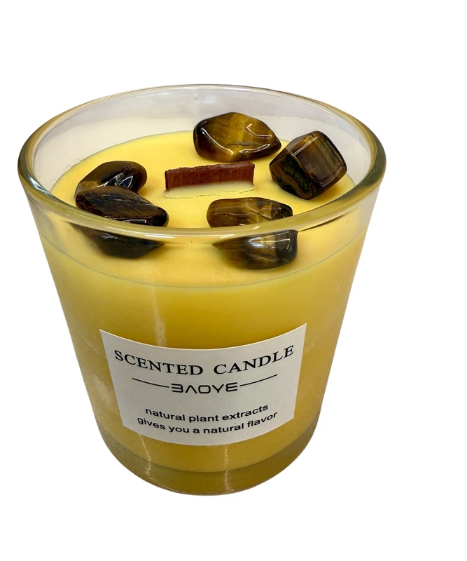 נר ריחני לימון מיוחד עם אבני קריסטל טייגר איי גודל 8 סמ גובה וקוטר