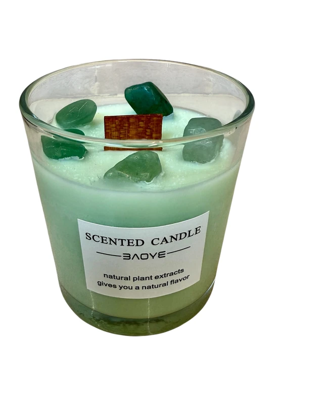נר ריחני תפוח עם אבני קריסטל אוונטורין גודל 8 סמ גובה וקוטר