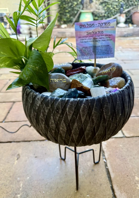 מזרקה כד קרמיקה מעוטר שחור אבן אילת מבעבעת מים צמחים אמיתיים