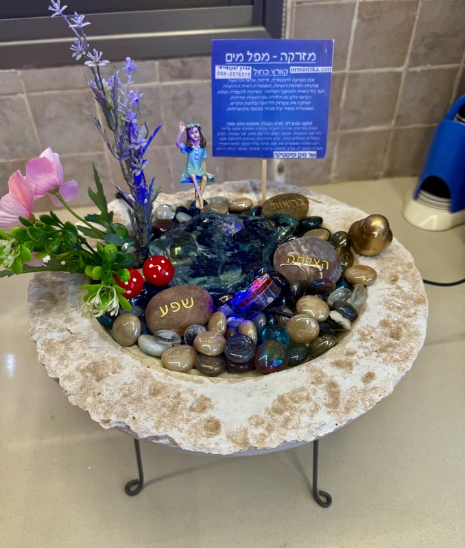 מזרקה עם אבן זכוכית מבעבעת מים ואבני זכוכית מסוגים שונים