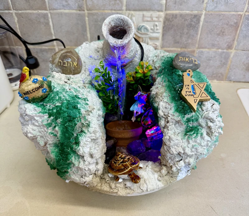 מזרקה בנויה אבני קריסטל אמטיסט כתובית ארץ ישראל שלנו