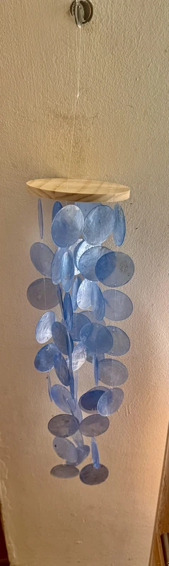מובייל צדפים תכלת מיוחד בעבודת יד על בסיס בוצר עץ